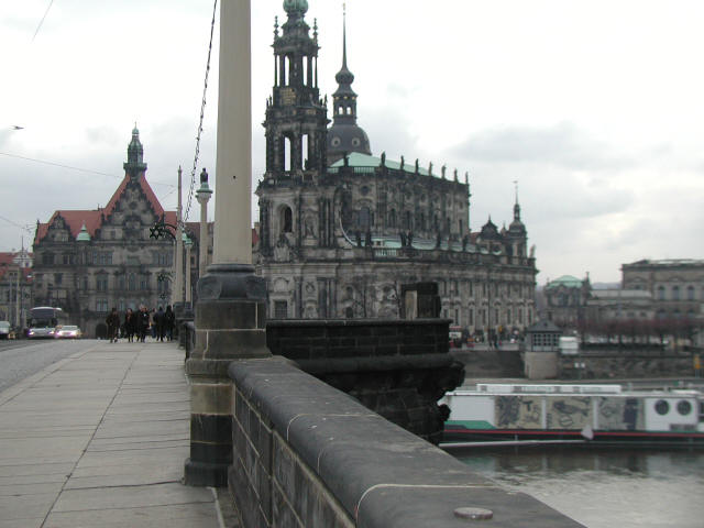 der Kirche liegt die Semper-Oper, links davon die Frauenkirche und das alte
